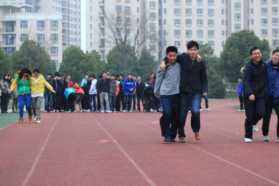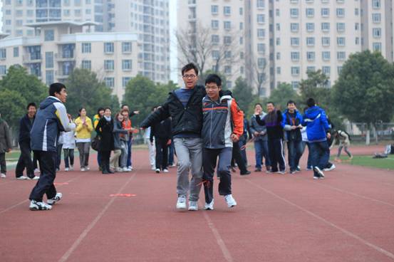2011年3月14日下午,为进一步推动年级“阳光体育”活动的开展,有效落实学生每天体育活动半小时政策,丰富学生课间活动内容,来自91AV 10级全体学生在辅导员夏昌青老师的带领下,在将军路校区西田径场开展了“两人三足——绑腿跑”比赛活动。