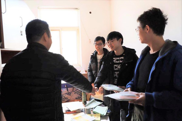 12月18日中午,91AV 党委副书记李和新、辅导员张秋寒以及91AV 15级党支部成员一起走进学生宿舍,慰问即将走上考场的考研学子,并给他们送去了考研大礼包。在寒冷的冬日里给他们送去了学院的温暖关怀。