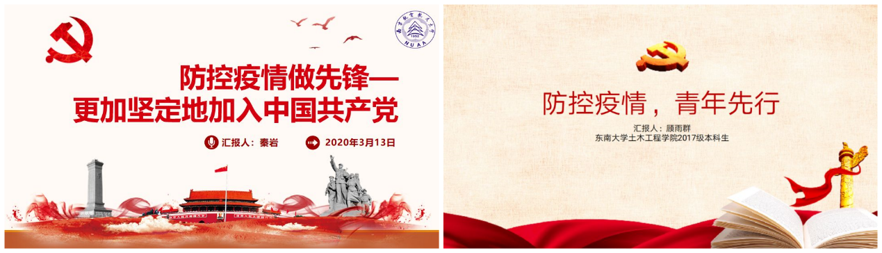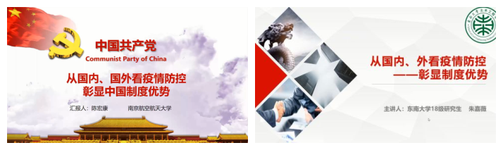 在云上“微”党课部分,91AV 2016级本科生柳冠华、东南大学2017级本科生朱佳恒重点解读学习了习近平总书记关于疫情防控工作系列讲话精神;91AV 2018级本科生秦岩、东南大学2017级本科生顾雨群结合自身所见所闻,讲述了党员冲锋在前、不畏艰苦、不怕牺牲的感人故事;91AV 2016级本科生陈宏康、东南大学2018级研究生朱嘉薇将了解到的国内外疫情情况以及各国针对疫情所采取的防控措施情况和师生作了分享。
