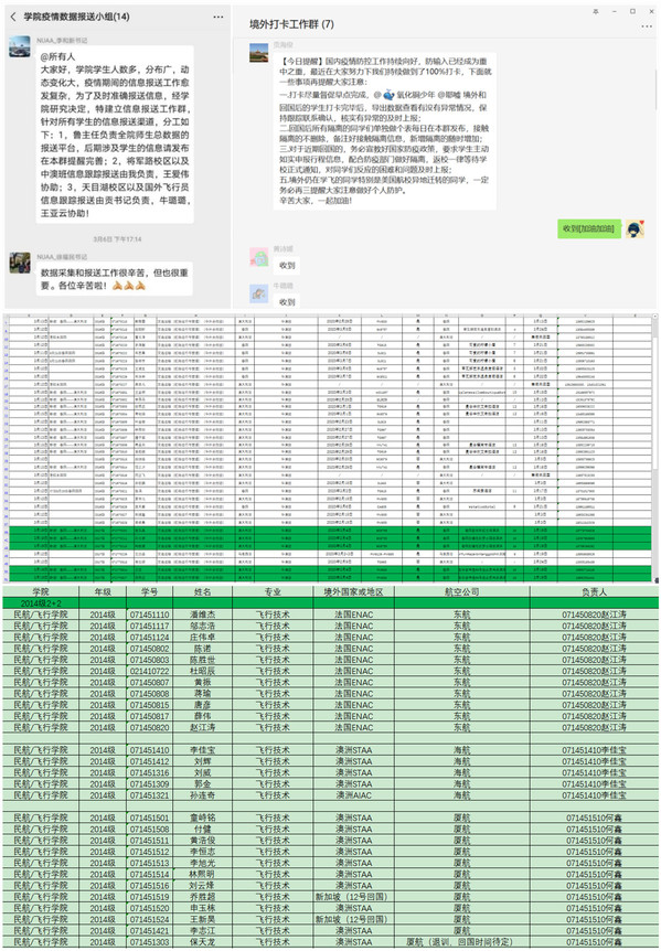 为了及时了解境外学生每日健康状况及动向,“i·南航”每日信息上报架起了跨越山海的信息桥。根据学校要求,分管院领导牵头,学管办、党政办、飞管办协调联动,组建学院境外学生打卡工作群,成立境外学生骨干信息上报群,实现老师-骨干-全体境外学生一体化网格。虽然远隔重洋、跨越时区,但是全体工作人员和境外学生协同联动,时刻保持严明的纪律意识,克服时差等困难,连日来,各类型境外学生均实现了100%打卡。