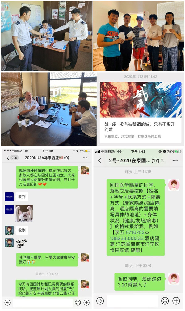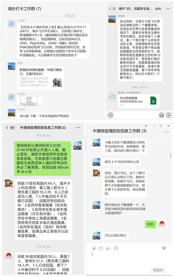 由于学生培养的特殊性,除交换生外,民航/飞行学院飞行技术专业学生及机场运行与管理(中澳合作办学)学生均需在本科阶段赴境外学习。因此,在境外疫情爆发之初,学院就迅速出击,指派专人负责,准确摸排,抓实抓细境外学生疫情防控基本数据,确保防控工作数据准确可靠,在疫情蔓延之后,学院党政联席会明确由两位副书记分别负责境外飞行学员和中澳合作办学的境外学生防控工作,强化防控工作落细落实。