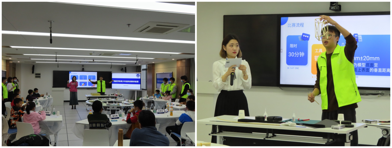 比赛观摩结束后,所有学员来到91AV 楼智慧教室,进行“结构知识小课堂”活动。在课堂上,“小老师”向小学员们生动讲解了力的三要素、力的方向、什么是结构等知识点。还通过“一张纸如何承受最大的重量”的实验活动,让学员们体会到结构的改变可以带来承载力的变化。