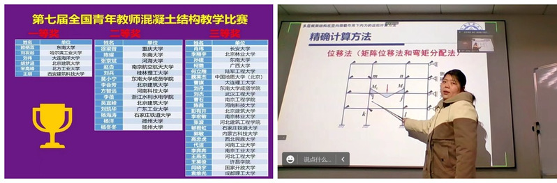 全国混凝土结构教学研讨会暨青年教师教学比赛每两年举办一届,旨在促进我国混凝土结构课程教学质量与青年教师教学水平的提高。本届教学比赛有来自东南大学、哈尔滨工业大学、重庆大学、河海大学、陆军工程大学和长安大学等,决赛采用线上直播的方式举行。比赛分A、B、C组(A组为985和211学校,B组为其他本科院校,C组为专科及职业技术院校),每小组设一等奖1名,二等奖2名。赵杏老师在土木系吴瑾、赵新铭、张丽芳、程晔、唐敢、陈娟、王喆、李俊、高磊和任贺贺等多位老师指导下,赛前精心准备,现场沉着冷静,发挥出色,取得了小组前三的优异成绩,最终荣获二等奖。