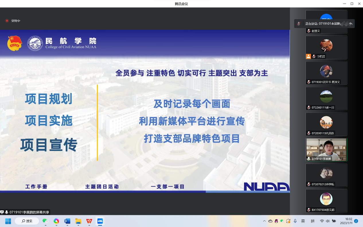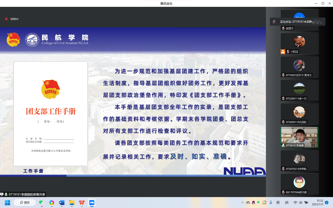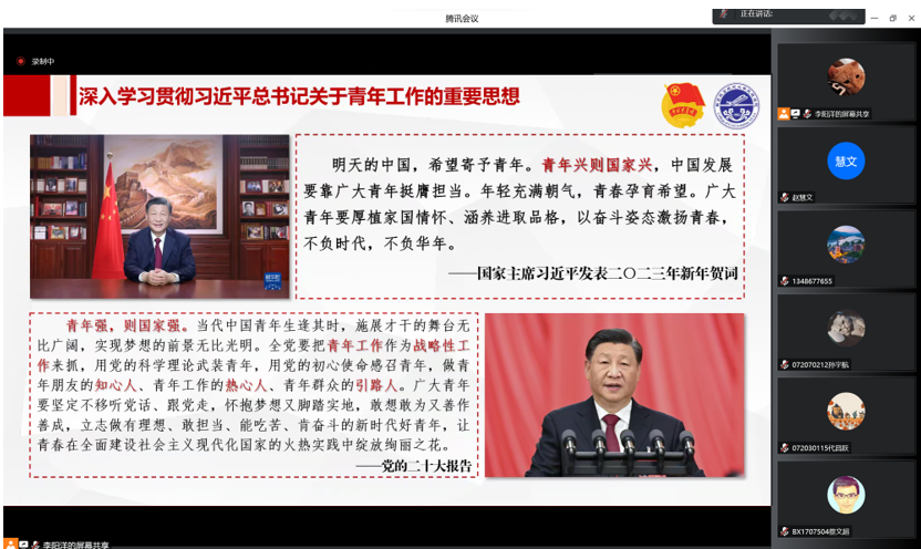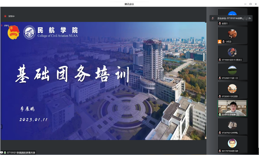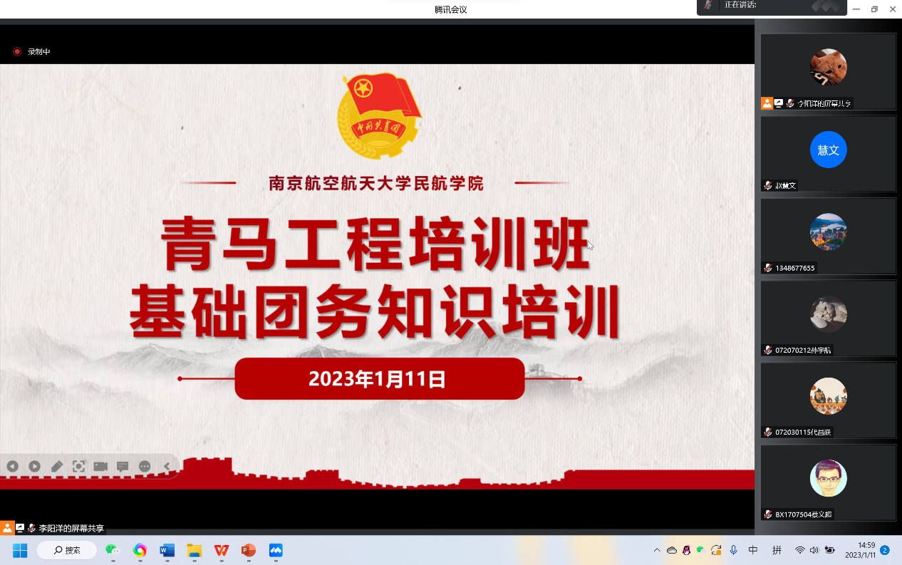 为提高基层团学组织骨干的理论基础和业务水平,进一步加强青年的思想政治引领,2023年1月11日下午,91AV 于线上开展青马工程培训班之基础团务知识培训。91AV 团委书记赵慧文、19级本科生优秀团干李展鹏、91AV 团委副书记李阳洋和全院团支书、团总支参与此次培训。