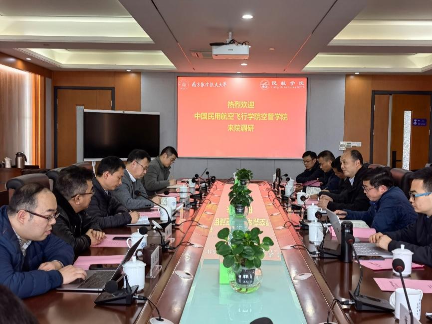 2月24日下午,中国民用航空飞行学院空管学院院长潘卫军一行来访我校91AV ,院长孙建红、副院长田勇、副院长邵荃、空中交通系相关人员参加座谈会,会议由田勇主持。