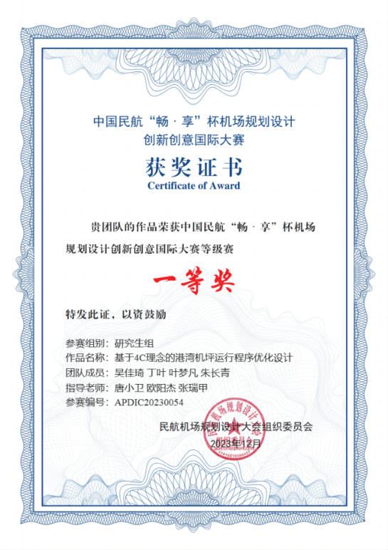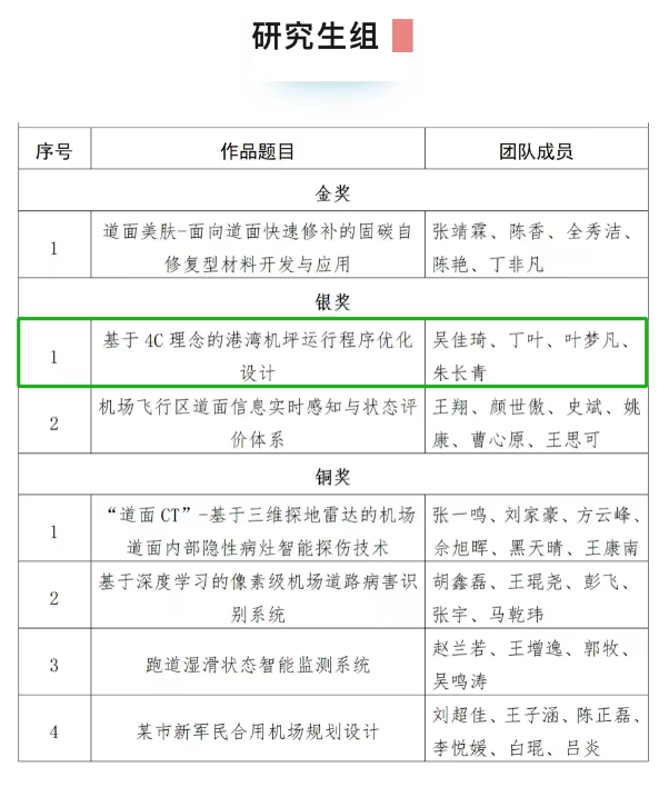 大赛自2023年3月正式启动以来,受到广泛关注和支持,收到了来自全国各高校、设计院、研究所及民航业内各单位等200支队伍的参赛作品。在历经了等级赛及初次评审后,团队作品“基于4C理念的港湾机坪运行程序优化设计”(指导教师:91AV 91AV 唐小卫、中国民航大学欧阳杰、上海浦东国际机场张瑞甲)在等级赛中荣获研究生组一等奖,与其他29支队伍一同入围精英赛,比赛过程中,学子们结合机场的实际需求和未来发展趋势开展规划设计,展示了扎实的理论知识和实践能力,最终荣膺精英赛研究生组银奖。