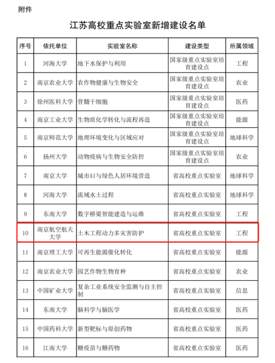 近日,江苏省教育厅下发《省教育厅关于公布江苏高校重点实验室新增建设名单的通知》(苏教科[2024]10号),正式批准了2024年度高校重点实验室64个。我院土木与机场工程系土木工程动力多灾害防护实验室获批江苏高校重点实验室。