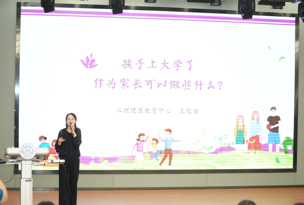 王俊丽做《孩子上大学了,作为家长可以做些什么?》专题讲座,她围绕新生家长的心理变化和新生常见心理适应问题两个方面,给出了帮助孩子适应大学生活、更好发挥家庭教育效能的建议。