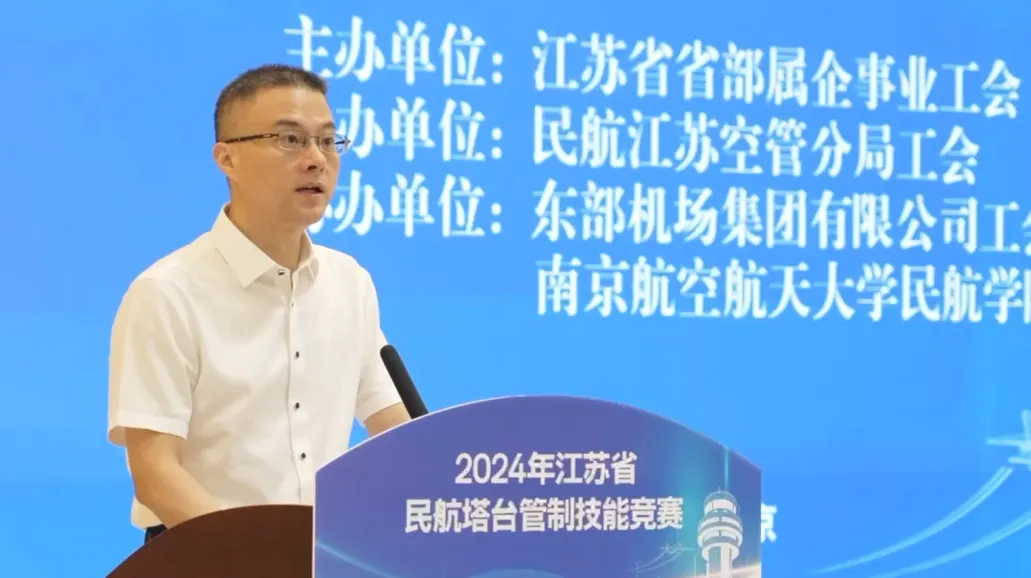 民航江苏空管分局局长丁浩致技能竞赛开幕词,他表示此次全省塔台管制技能竞赛致力于搭建院校、机场、管制人员等多方互动交流平台,希望各位参赛选手通过比赛达到相互学习、共同提高的目的,将竞赛中学习到的宝贵经验、先进做法融入到塔台管制工作实践当中,为江苏民航高质量发展添砖加瓦、贡献力量。