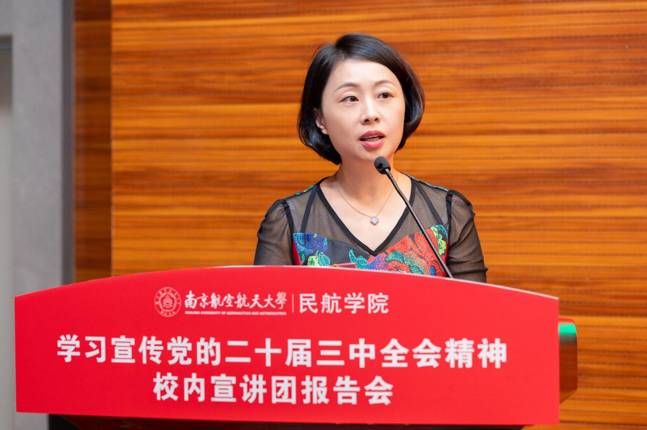 李君代表学院党委感谢刘向雷教授的精彩报告,指出本次宣讲内容丰富、深入浅出,既有理论高度、又紧密结合民航特色,生动形象的分析解读了关于民航绿色低碳转型的丰富内涵,对于学院师生更好地理解党的二十届三中全会精神起到了非常好的指导和启发作用。她号召全体师生以实际行动把智慧和力量凝聚到全会部署的各项改革任务上来,全方位不断塑造发展新动能新优势,推动学校、学院工作再上新台阶。