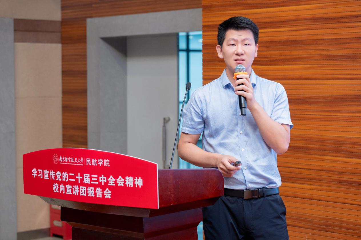 刘向雷以“学习贯彻二十届三中全会精神 加快民航绿色低碳转型”为题,围绕全会的基本情况、深刻领会和把握全会的重大意义、习近平总书记关于全面深化改革的重要论述、全会对进一步全面深化改革做出的重要部署等方面进行了系统全面的解读。重点阐释了二十届三中全会提出的深化生态文明体制改革相关内容,并针对国家提出经济社会全面绿色转型的重大需求,分享了对民航业绿色转型、绿色能源航空器研究的一些思考以及近年来学校在全电推进动力系统、混合动力、绿色航空燃料制备、航空器综合能量管理等研究领域取得的研究成果,希望民航师生们也能在“双碳”目标达成的道路上贡献出属于南航91AV 的智慧和力量。