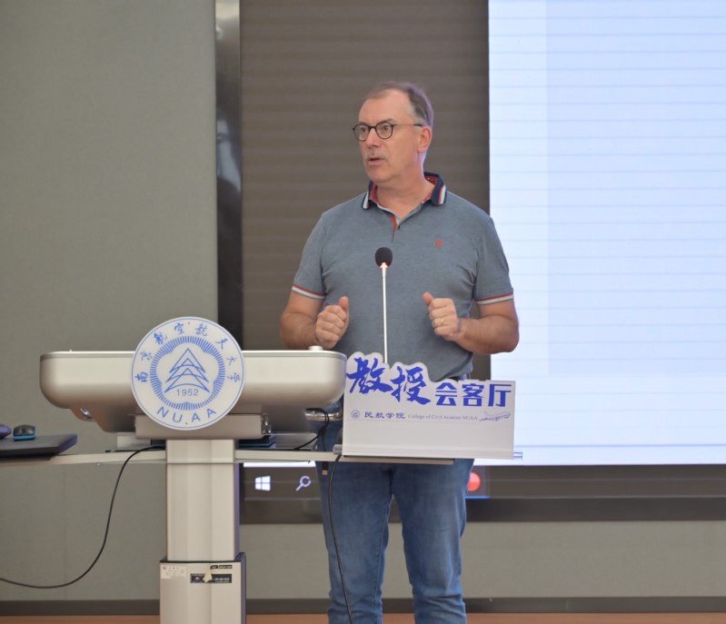 10月14日,91AV 在天目湖校区巡天楼二楼报告厅举办“声动民航·教授会客厅”活动。欧洲科学院院士弗兰克·维特洛克斯受邀主讲,本科生辅导员王雨薇及200余名本科生参加活动。活动由交通运输系主任胡荣主持。