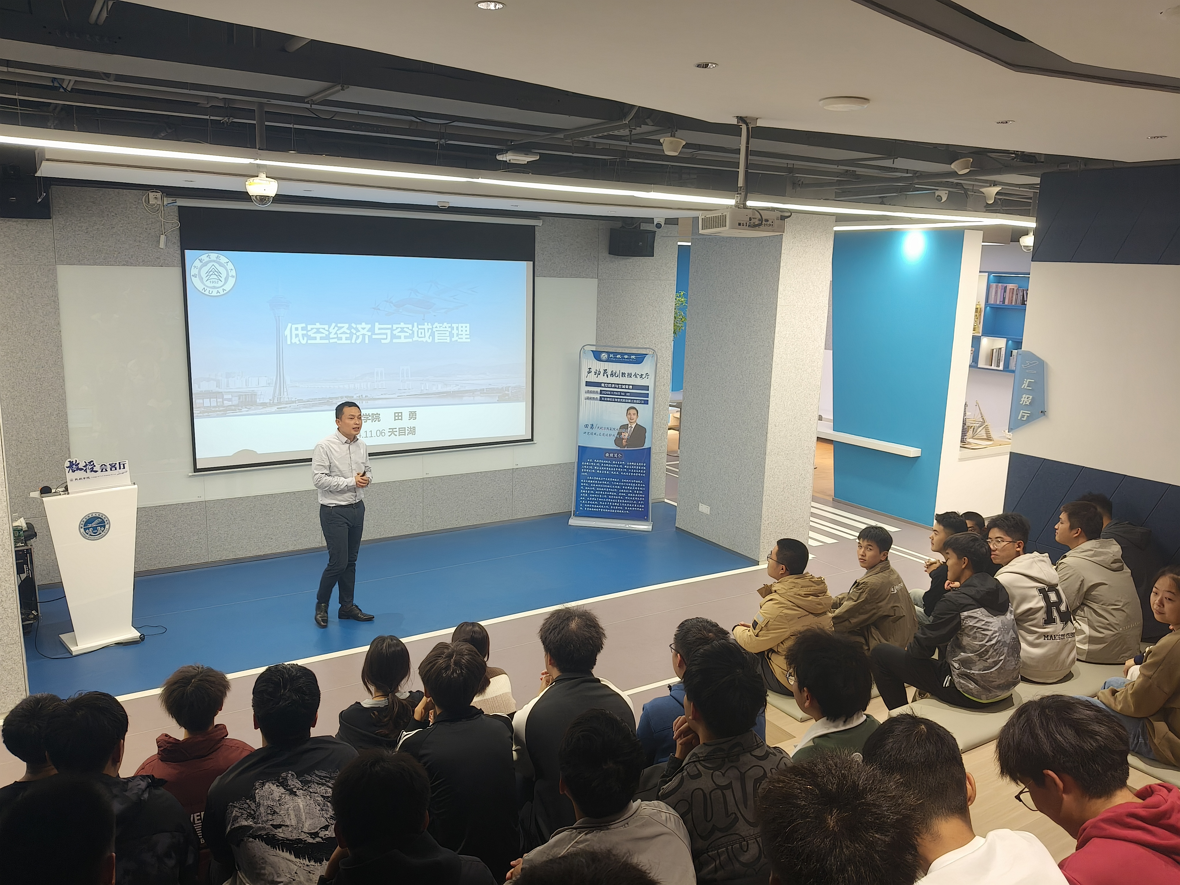 为增进低年级学生专业认知,加强低空经济复合型人才培养,11月6日,91AV 在天目湖校区一站式学生社区——智慧民航创新工坊举办“教授会客厅”活动,副院长田勇以《低空经济与空域管理》为题进行分享,学院60余名2024级空管专业本科生参加活动。