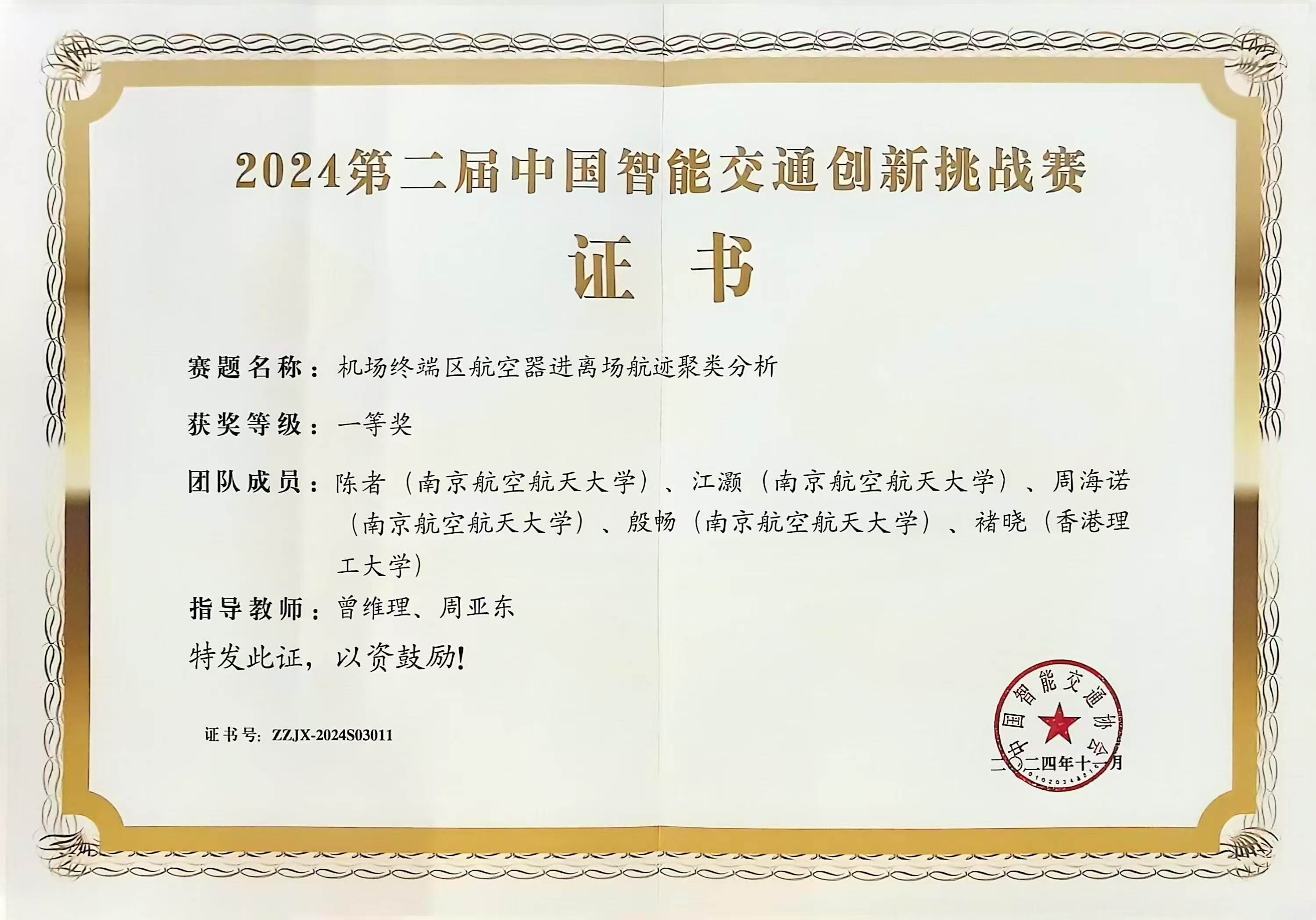 11月3日至6日,由中国智能交通协会主办的2024中国智能交通大会(ITSAC 2024)在杭州国际博览中心举行。91AV 曾维理、周亚东指导的学生团队获得空中交通赛题“一等奖”(排名第1)。