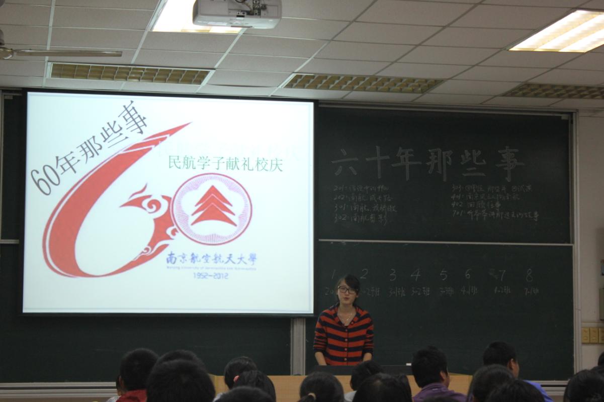在开学初的第一次年级大会上,91AV 2012级所有学生观看了南航发展六十年的视频,视频生动再现了南航的历史与积淀,也让新生对南航,对这个即将生活四年的地方有了直观的认识。同时,年级大会上辅导员也以南航六十年发展轨迹为线索,结合2012级新生的成长脚步,以“南航——成就梦想的地方”为题向大家讲述了梦想的南航,让新生与南航建立了新的链接,有了更加感性的认识。为了让各位同学尽快的适应大学的学习生活,了解南航,在新生军训期间,学导们也深入到宿舍中,介绍南航,向同学介绍他们眼中的南航,他们在南航遇到的人、发生的事,逐渐增加了同学们对了解南航历史的兴趣。建立了理性与感性的认识之后,年级建立了自主学习网络平台,在人人网、年级微博上对校史知识进行介绍,同学们通过浏览网页和留言互动,进一步加深了对校史知识的掌握。