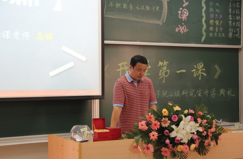 在一阵悦耳的上课铃声中,12级研究生开学第一课正式启动。在第一篇章——理想篇中,91AV 党委副书记高健老师为同学们做了关于理想壮志、勇于担当发言。高书记从实际生活中的小事例出发,谆谆教诲,告诉同学们青年树立正确的人生观、价值观以及远大理想的必要性与重要性。从高书记循循善诱的讲话中,同学们无一不受到感染、心潮澎湃。