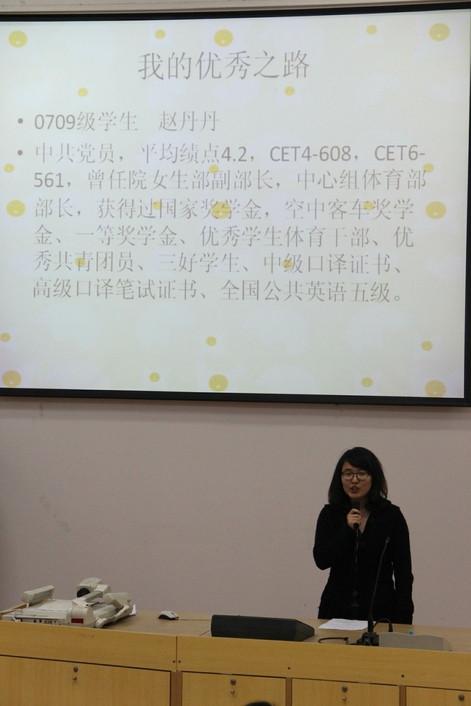 虽然已经走在了优秀的道路上,但距离彼岸,那个未来的自己还有一段距离。彼岸的优秀是什么样的?本次大会也邀请到了保送东南大学的我院09级学生赵丹丹以及就职于东航江苏分公司的我院06级校友叶超在现场讲述他们的优秀故事。他们都强调只有坚持学习、坚持努力才能向目标靠的更近;只有忍得住辛苦、耐得住寂寞才能离未来那个优秀的自己靠的更近。听了学姐学长的介绍,同学们对自己的发展方向更加清晰,也对自己的未来充满信心。
