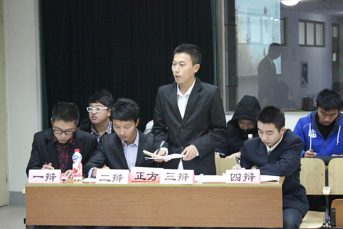 在5203教室举行的一场辩论赛主题为“全才与专才,何种更具竞争力”。正方支持全才而反方支持专才。首先分别由正反方一辩进行陈词,简略叙述其所选立场的基本理由。双方一辩的叙述都有较强的逻辑性,并能结合当前的国际形势发表自己对全才与专才的观点。一辩结束后开始进行的是更加激烈的攻辩与答辩环节,紧紧围绕本次主题,辩手们在阐述本方立场之余对辩方提出了更多的质疑,而答辩者则结合自身经历与目前所学的专业给出了有理有据的答辩。短暂小结后紧跟的是正反双方的自由辩论,双方对观点的剖析逐渐变得更加精准而到位,认识的深度也开始渐渐显现。对全才与专才的理解更是结合当代大学生的现状进行了辩论探讨,将本场活动推向了一个高潮。最后正反辩方分别派代表进行总结陈词,对整场辩论内容汇总并凝练概括。