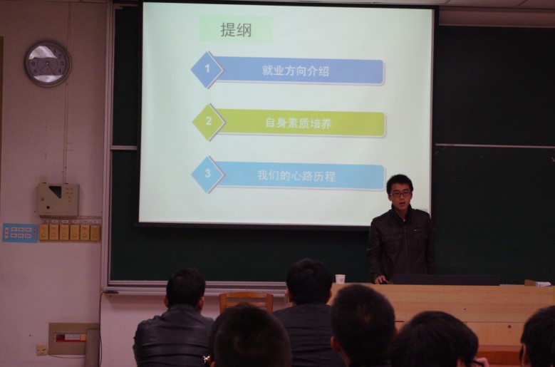 在活动的第一个环节,院研究生会的杨翼给同学们介绍了91AV 的基本就业情况。他首先以“我们能去哪儿?”的问题引出了与91AV 相关的一些单位,然后给大家细致讲解每一个单位的要求以及面向的专业。随后,他通过图表分析,给同学们介绍了91AV 毕业生的基本去向,让同学们对于就业有了一个直观的认识。