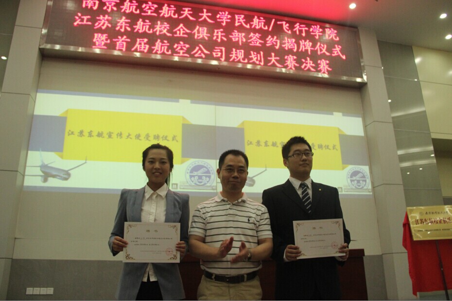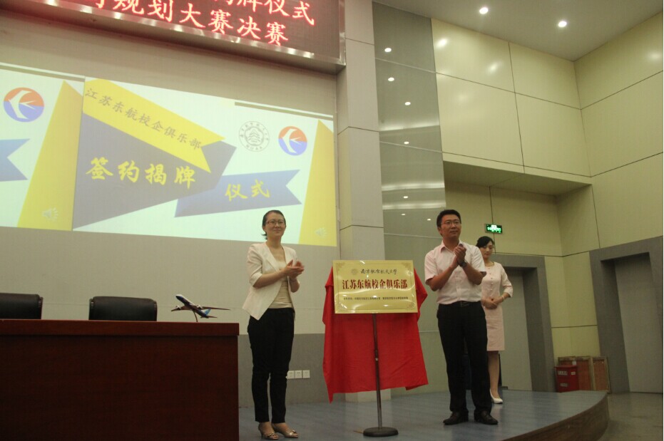 2014年6月13日晚上7点江苏东航校企俱乐部签约揭牌仪式在我校将军路校区一号楼四楼报告厅隆重举行。出席此次揭牌仪式的有江苏东航人力资源部规划配置部管理主管王心磊女士、飞机维修部副总经理兼总工程师肖志华、飞行签派分部高级经理杨加勇先生、飞机维修工程部工程师陈勇先生、人力资源部王树红女士,校学生处副处长许爱华老师、91AV 党委副书记宋凯老师、91AV 交通运输工程系主任曾小舟老师、91AV 交通运输工程系吴薇薇老师。参加此次揭牌仪式的还有校企俱乐部首批会员以及来自民航/飞行学院的老师与同学。