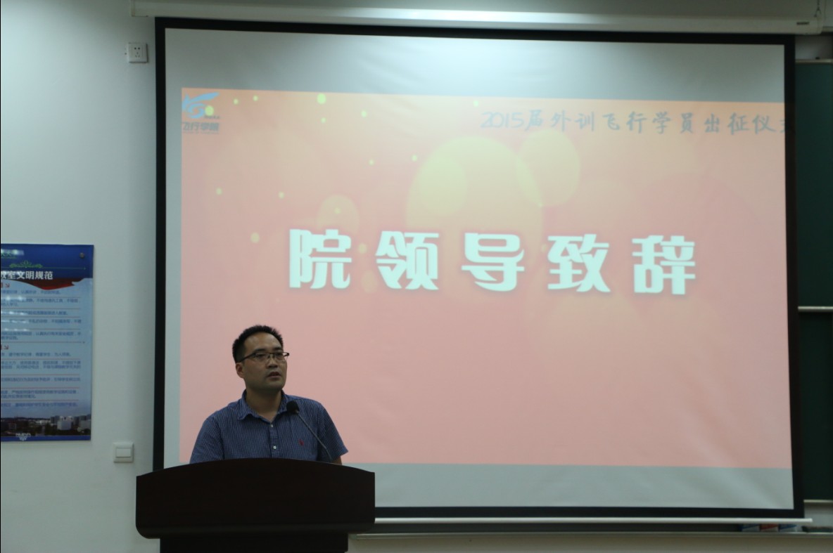 6月18日16:00,91AV 飞行学院在将军路校区D1213教室隆重召开2015届外训飞行学员出征仪式。参加大会的有91AV 飞行学院党委书记倪晓众老师,飞行学院院长阎雷老师,民航/飞行学院党委副书记宋凯老师、飞行学院院长助理丁松滨老师,以及飞行技术系的老师和辅导员老师们。