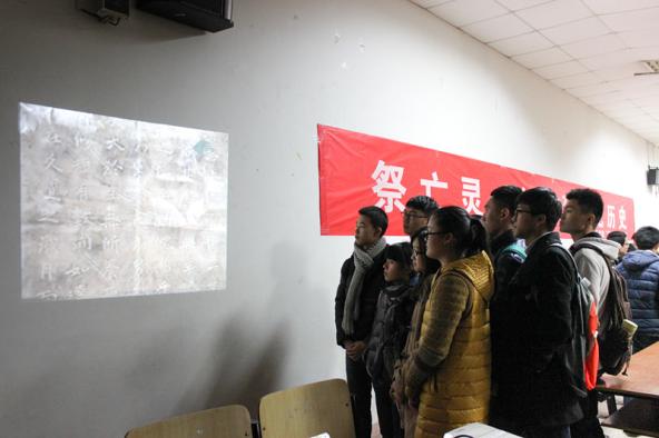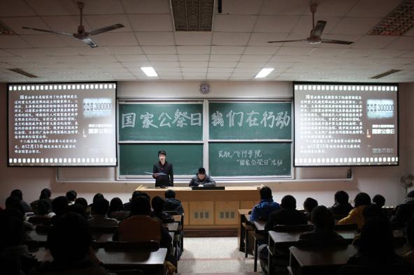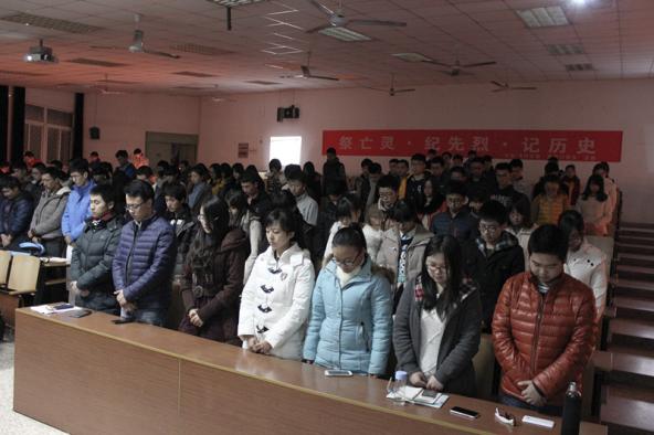 2014年12月12日晚八时许,在12·13国家公祭日来临之际,民航/飞行学院组织同学在91AV 将军路校区4101教室举行了全国公祭日——“祭亡灵,纪先烈,记历史”主题活动,为南京大屠杀三十万余遇难同胞而痛心哀悼。13级辅导员康冲、14级辅导员梁欢出席本次活动,与学生一同悼念同胞。