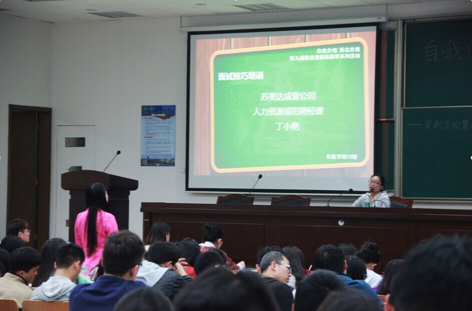随着就业工作推进,航空公司校企联合培养面试开启在即,为了让学生以完美的方式展现在面试官的面前,2015年4月22日晚7点,91AV 开展了职业素质拓展季系列活动之“自我介绍,秀出自我”讲座,邀请苏美达成套公司人力资源部丁小艳经理、91AV 拥有六年就业工作经验的辅导员傅成成开展讲座。