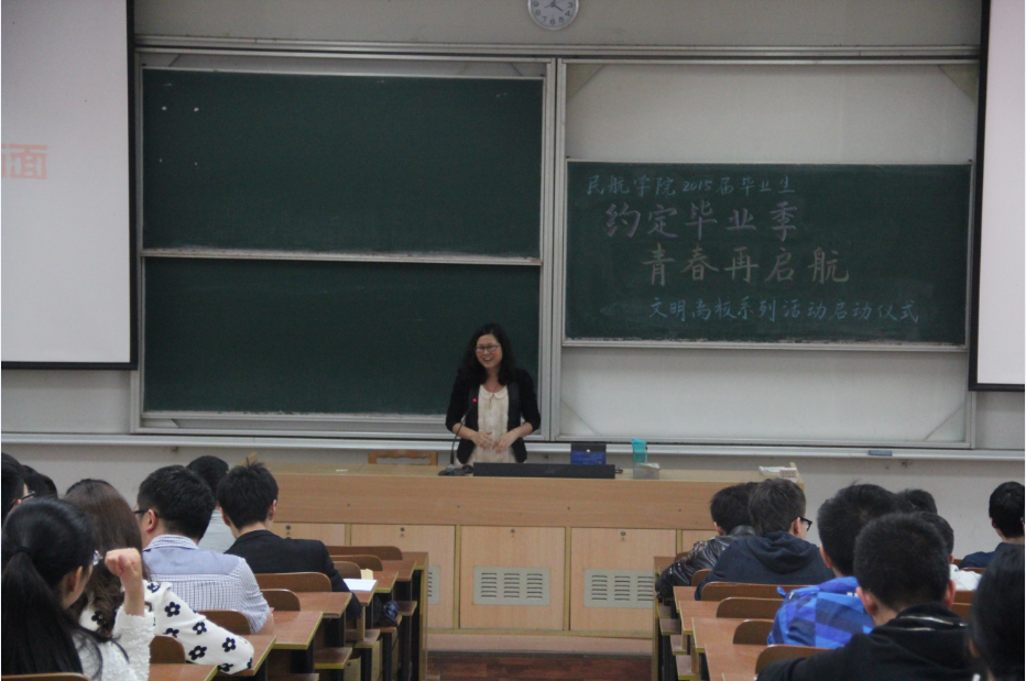 本次启动仪式分成两个环节,回顾篇,图说青春岁月;惜今朝,完美谢幕;其中,回顾篇,傅老师先用22张照片与毕业生一起回顾那些值得铭记的相伴岁月。从2011年9月3日的新生见面会,到如今已经进入倒计时的相聚,四年间,2015届民航毕业生在辅导员老师的陪同下,一起奋斗、一起感悟、一起成长。而到今天,他们终于收获了一份满意的就业答卷,准备迈入祖国民航的各个角落,把在91AV 所学、所得奉献于社会。在感怀往昔的同时,傅老师倡导大家珍惜当下,文明离校,感恩回馈母校。