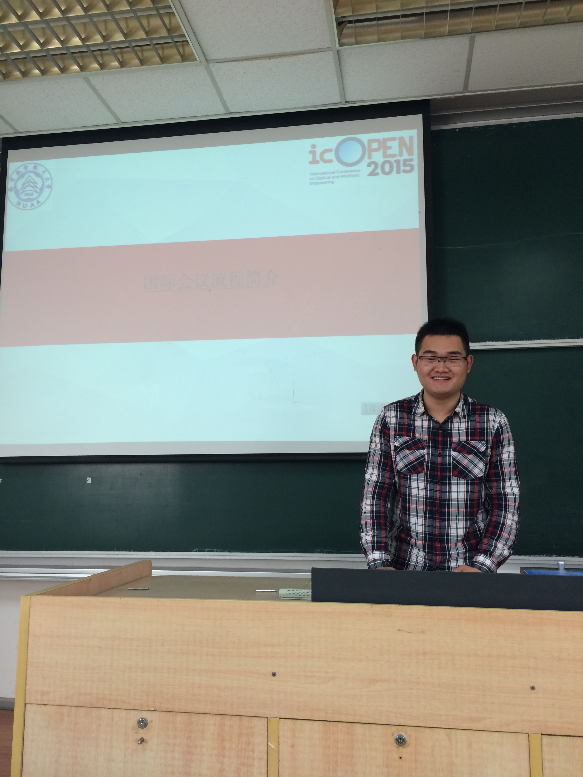 活动伊始,主持人王祥介绍了此次微沙龙的受邀嘉宾柳树林同学。柳树林同学是91AV 91AV 2014级硕士研究生,刚刚在新加坡参加完国际光学与光子学工程会议。该会议在国际上具有较强影响力,参与者以教授学者和博士居多,柳树林同学以硕士研究生的身份参加该会议,收获很大。此次邀请也是希望柳树林同学能够分享他参加国际会议的经验。