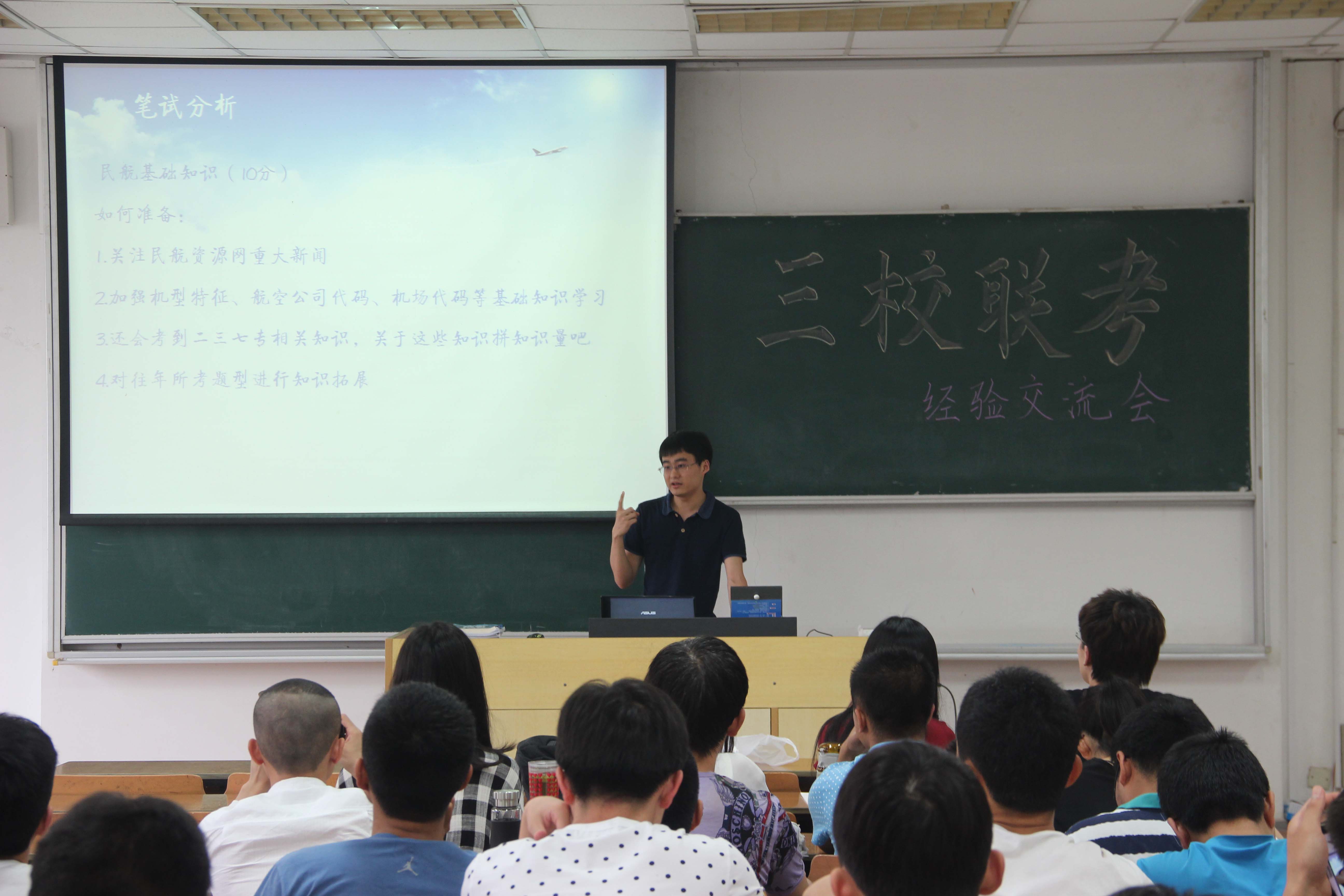 对于91AV 空中交通管理与签派专业的学生来说,就业空管各单位需要经过“三校联考”这一环节,所谓三校联考是由中国民用航空局空中交通管理局面向中国民航大学、中国民航飞行学院和我校举行的民航空管系统管制员招录考试。为了让空管专业学生更加顺利地通过考试,有资格参加各管制单位的面试,我院12级于5月26日下午4点,在6101教室举行了三校联考经验交流会,邀请到我院11级空管专业的优秀学生王挺和张雅雯对学生们进行集中辅导。