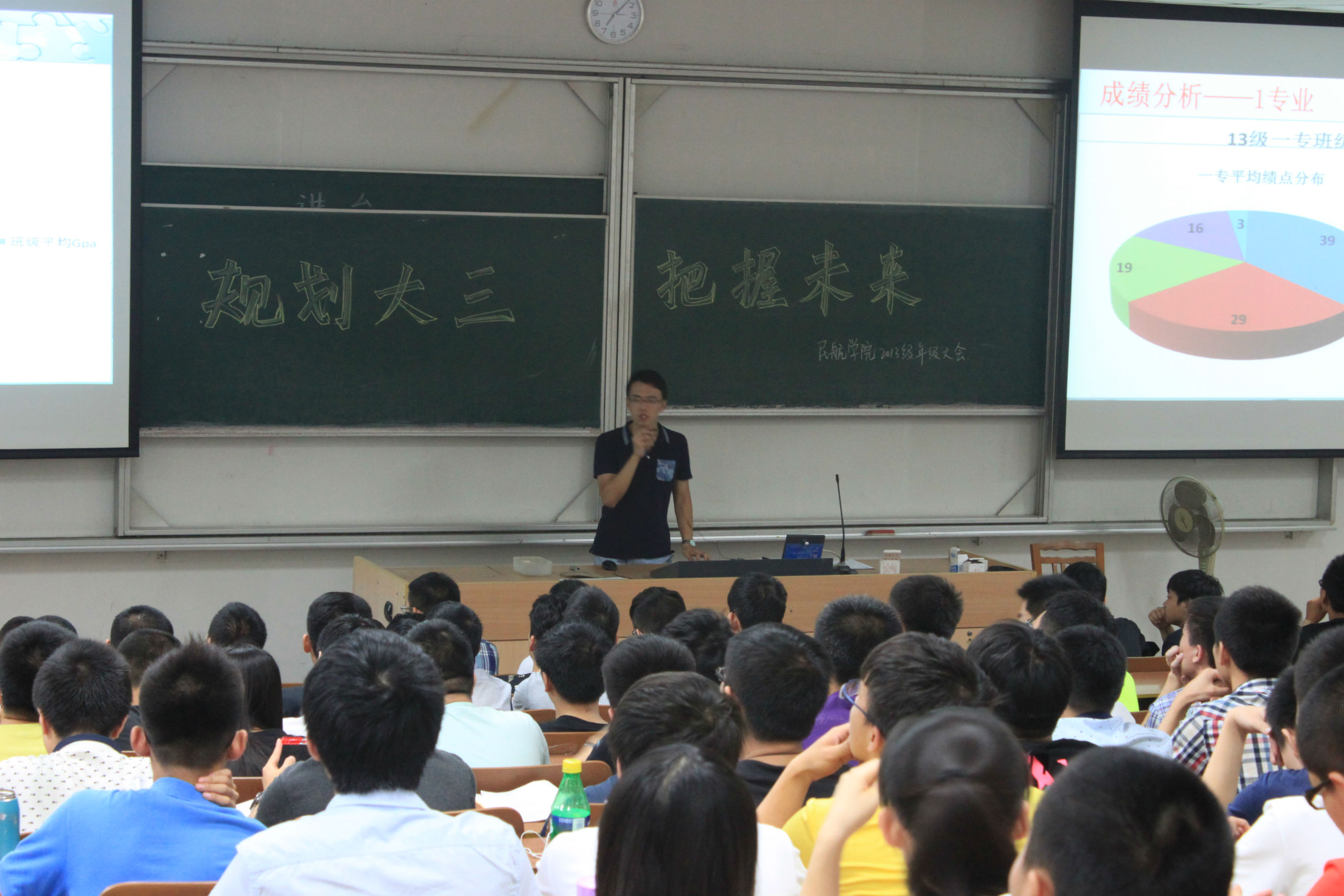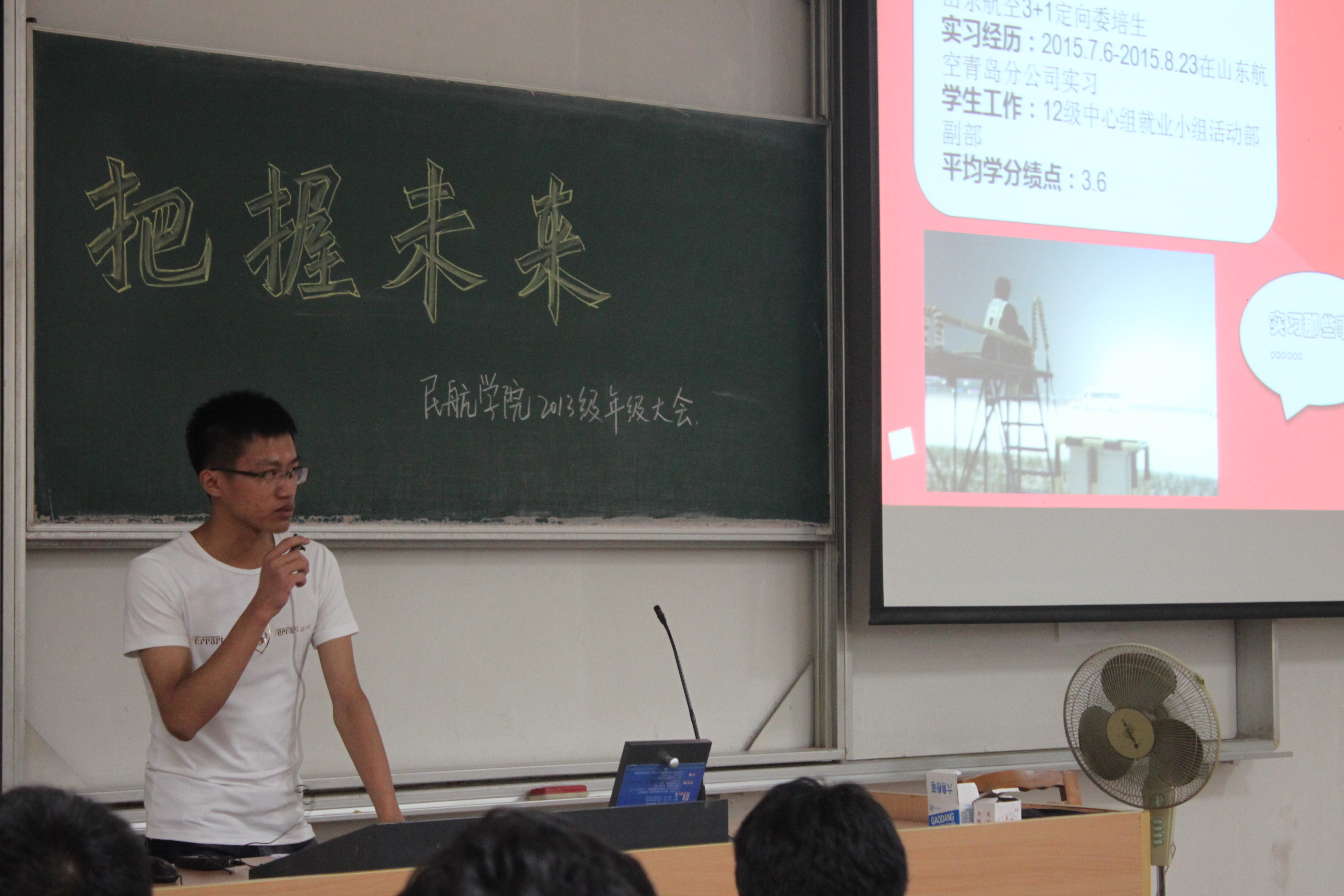 这个暑假,91AV 13级的同学借助学院“民航联盟”的校企合作平台,数十名同学进入各大空管局和航空公司进行实习实践。本次年级大会邀请了其中三名同学与大家分享他们精彩的暑期实习之旅。其中机务工程专业的郭家琛同学结合在奥凯航空的亲身经历详细的介绍了维修工程部的部门组成,消除了部分同学们对毕业后只能从事一线工作的误解。随后,成功签约山航的12级学生黄加发也与同学们分享了自己面试过程的经验,他针对面试中涉及的英语问题和行业所需要的民航3A体检标准为13级的学生作了介绍。