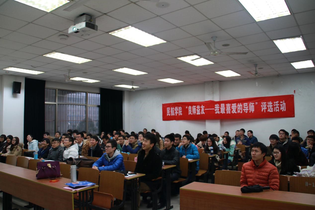 活动初始环节为“我最喜爱导师风采展示”,共有六位同学代表分别从工作与生活两方面介绍了心目中最喜爱的导师。从他们的ppt演讲中可以看出91AV 有着众多优秀的老师:桃李满天下,心系学生毕业后工作的胡明华老师;勤奋严谨却又被学生亲切称为“朱爷爷”的朱金福老师;科研行政两手抓,积极为学生着想的葛红娟老师;长着有特色的眉毛,不仅对自己专业,更对哲学也有研究的左洪福老师;作为国内航空器适航技术带头人的孙有朝老师;热心指导学生科创活动,分享人生经验的顾宏斌老师。这些同学的详细介绍,不仅给在座同学带来了老师们不一样的形象,同时也加深了同学们对身边老师的进一步了解。