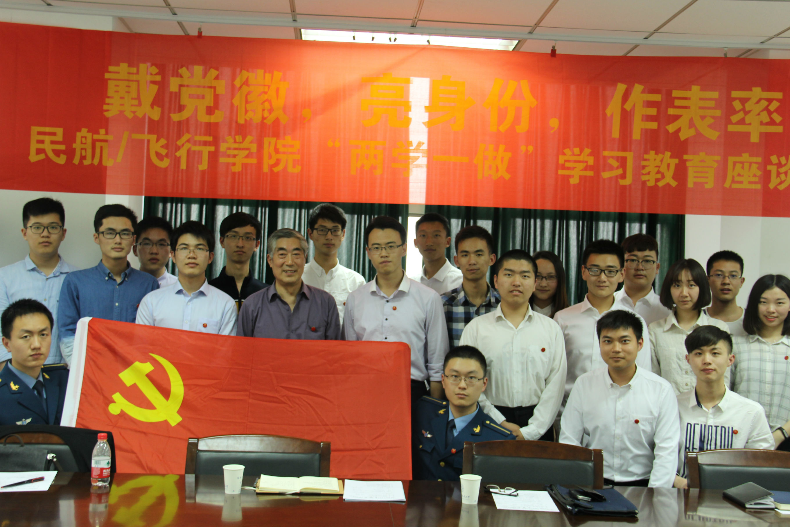 汇报完毕后,丁书记与同学们展开了有趣的互动。双方就“戴党徽”一事表达了各自的看法,总体思想概括为:活动只是一种形式,为避免戴党徽流于形式,党员需时时刻刻接受群众监督,加强对党的学习认知,担负共建共产主义的重任。丁书记也与同学们闲谈了从党50多年来的经历,他用幽默的语言,传达了质朴的精神,教育大家“做人一定不能逾越底线”。会议最后,丁书记为各位党员佩戴党徽,全体党员和护旗手进行合影留念。