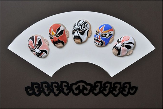 “脸谱的形式、色彩和类型上有一定的格式,我们常运用一些夸张和变形的图形来展示角色的性格特征。比如眼睛、额头和两颊通常被画成蝙蝠、蝴蝶或燕子的翅膀状,再加上夸张的嘴和鼻子,就可以制造出所需的脸部效果啦!”每谈及一类脸谱造型,程少岩老师总是忍不住表演几招儿,再看他走路时露出的“戏剧腔”,两脚蹬地咚咚闷响,早前武生演员的舞台经验,“文革”后期开始从事舞美设计,后来研究、创作脸谱自然水到渠成。