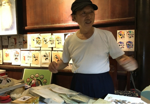 “我讲个笑话你听,上次一起去台湾布展,其余人都在卖作品,只有我不卖作品,在免费教台湾群众画脸谱,结果大部分人都围拢到我的展台前来了,其余同去的人恨死我了,哈哈哈!”老先生边说边笑。