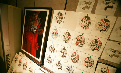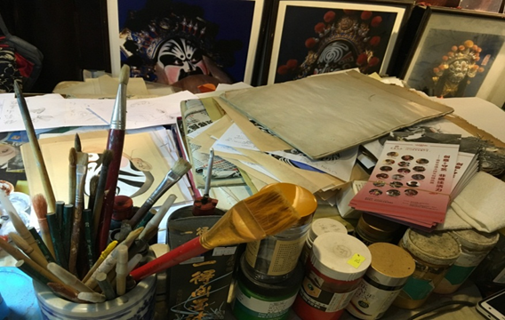 在甘熙故居的一间工作室里,一位老先生正专心地进行着脱胎脸谱创作,一笔一勾勒,一点一神韵,一张张脸谱在老人的笔下充满了灵气,集聚了世间百态。工作台上罗列着各色颜料罐以及各类笔刷,手头还有纸上的铅笔草稿和未完成的几个脸谱模子。