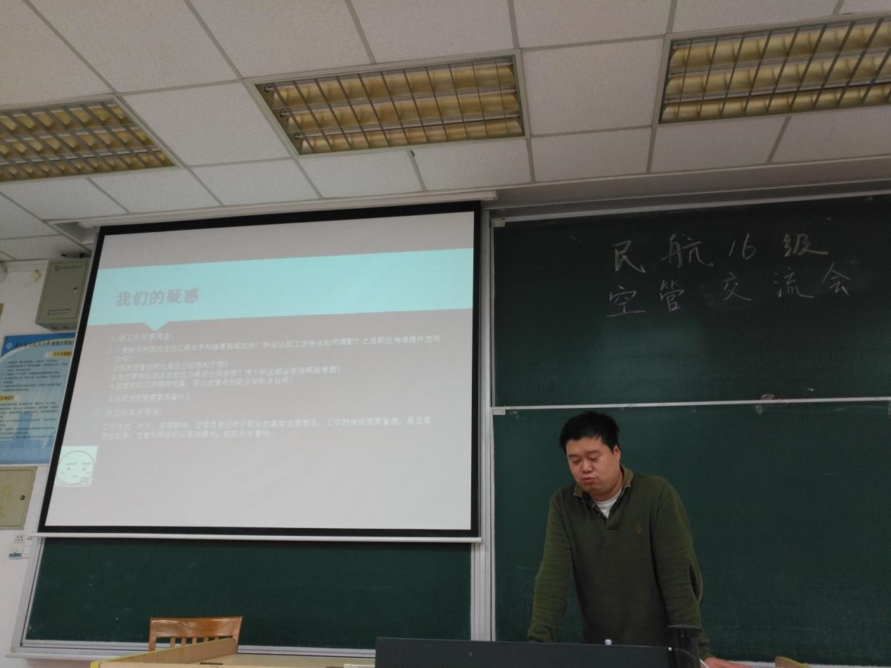 10月26日下午2点在6302教室,91AV 2016级举行了“从‘虹桥机场事件’说开去”空管专业交流会,邀请到空管系副主任孙樊荣、91AV 2015届毕业生、江苏空管分局管制员王挺到现场与学生交流。
