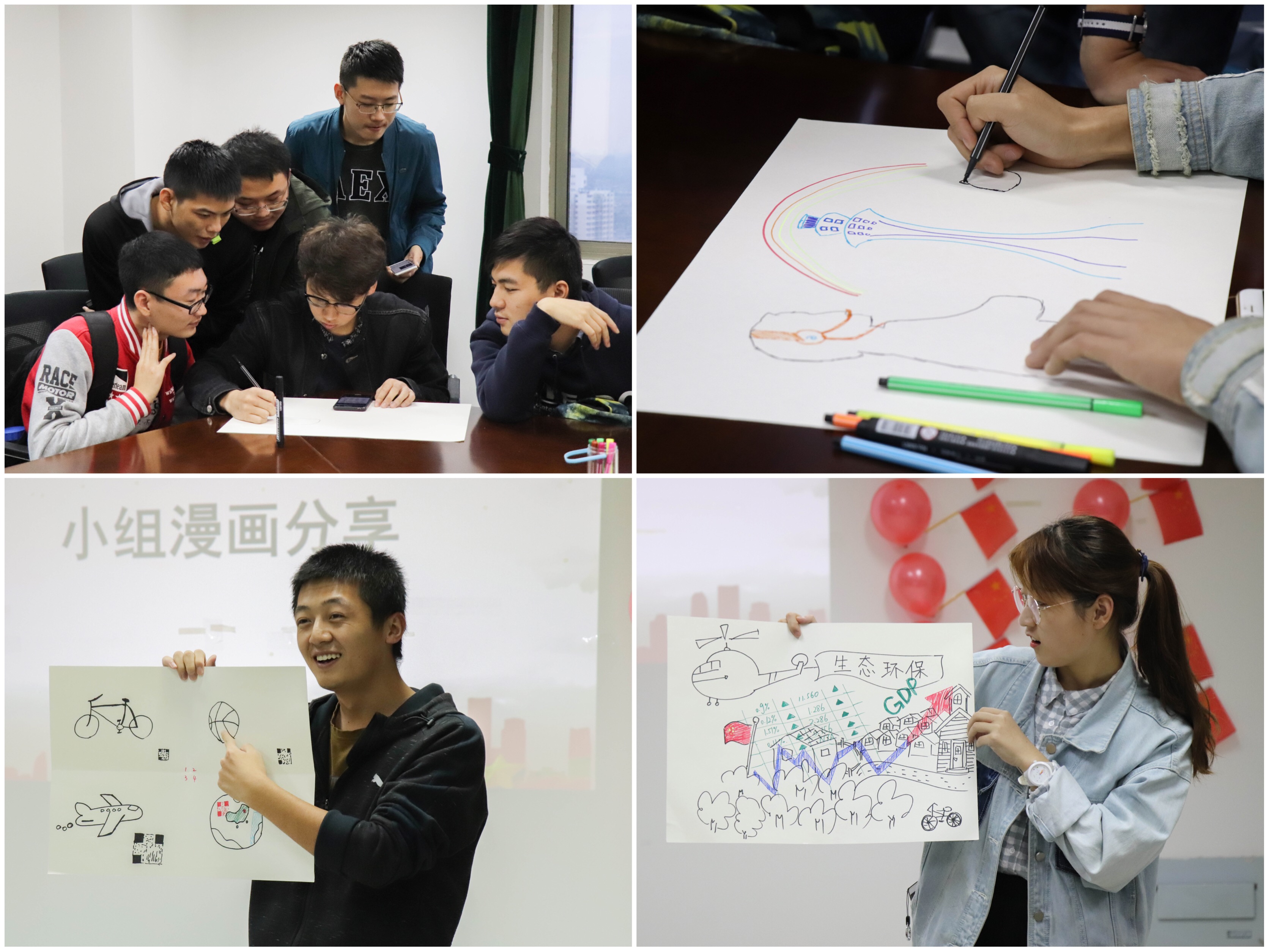 第三个板块为“十九大我来画”,同学们拿起画笔,画出自己想象中的“未来中国”。最终的画纸上有在外太空管制的空管,也有逐步发展的代表中国走向世界的二维码,还有同学们对未来生态环境的种种美好设想。这些都是同学们留存内心,坚定的中国梦!