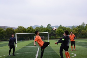 4月14日上午,比赛在91AV 师生们的期盼中精彩开赛。细雨蒙蒙,却浇不灭师生们比赛的热情,短暂的热身活动之后,秉着“友谊第一、比赛第二”的精神,由我院老师组成的“1队”与由我院学生组成的“2队”两支代表队在摄像机前合影留念,并相互握手致意。片刻的准备之后,我院与赛师生迅速进入状态,四散开来,排兵布阵,在球场上奔跑起来。