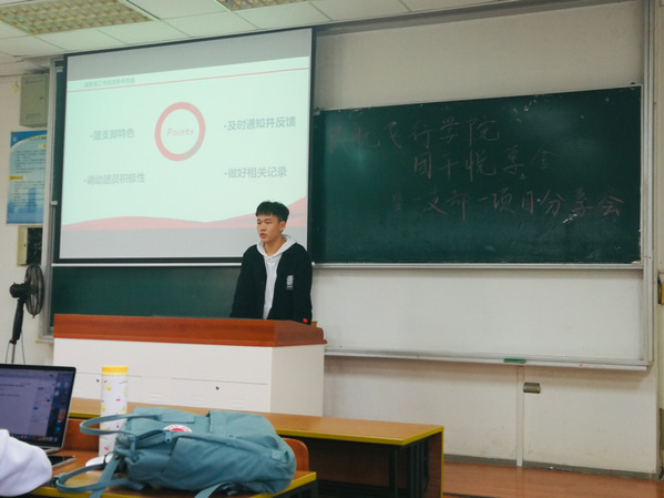 本次悦享会首先由团委组织部副部长张蕴简单介绍了团支部工作指南,对各团支部提出了发挥支部特色,做好活动记录的要求。随后,组织部副部长邓心豪对“一支部一项目”的工作要求,立项及评比的时间进程进行了相关说明,阐述了“一支部一项目”的目的和影响。