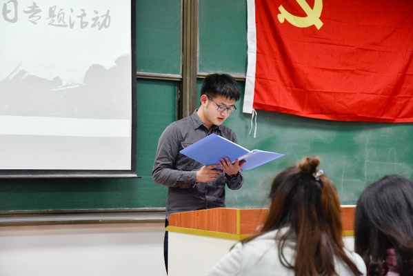 大会伊始,由一支部第二党小组致开场词,“紫金山含悲,秦淮河低回……”,同志们声情并茂的朗读为整个大会奠定了沉重的基调。在沉重的气氛中,全体同学起立,一同为在南京大屠杀遇难的同胞默哀三分钟。大会第二环节由党支部各党小组带来的诗朗诵。诗朗诵以“缅怀历史,砥砺前行”为主题,呈现了人民面对敌人,从屈辱承受、艰苦抗争到最终胜利的全过程。《南京,我的南京》中的“泪干血尽”的无助与绝望、《紫金花》中“焚烧冷漠,驱赶黑暗”的精神、《山河永固》中从容赴死、马革裹尸的豪气无不感染着在场的观众,对党员同志们精彩的朗诵,同学们致以热烈的掌声。