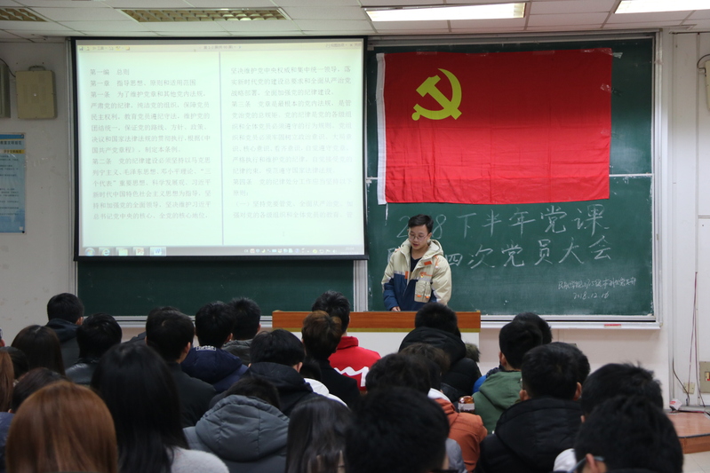 12月16日晚,91AV 15级党支部在将军路校区6101教室举办了关于《中国共产党纪律处分条例》的党课学习。本次党课学习包含了15级党支部正式党员及预备党员共七十余名学员,党支部书记杨靖宇同志作为主讲人,主持了这次学习活动。