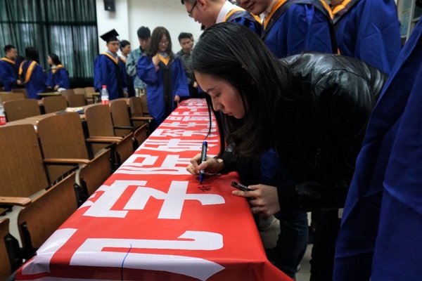 最后在南航校歌中,毕业生们在横幅上签名合影结束了这场“研途•玖别,青春不散场”的主题班会。最后一课主题班会活动是91AV 研究生会举行的毕业季传统的特色活动,为毕业生们提供互诉离殇、憧憬未来的平台。衷心祝愿91AV 2019届全体毕业生在新时代锐意进取,胸怀使命与担当,勇于拼搏与奋斗,常怀感恩之心,在人生画布上添抹色彩。