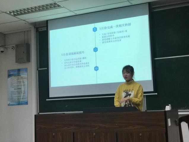 交流会第二个环节为就业经验分享。季雁彬学姐就自己从确定目标,到努力付诸实践,乃至最后获得自己理想的岗位的经历进行了分享,作为一名优秀的准毕业生,从准备阶段开始,带领同学们身临其境的了解就业准备和应聘的流程。卢子钊学长则讲述自身当初考研和就业的纠结到最后的抉择的经历,道出了很多同学的心声,引起了很多同学的共鸣。同时卢子钊学长关于这方面给予了很中恳的建议,并告诫同学们要在做决定前协调好和亲人之间的关系。