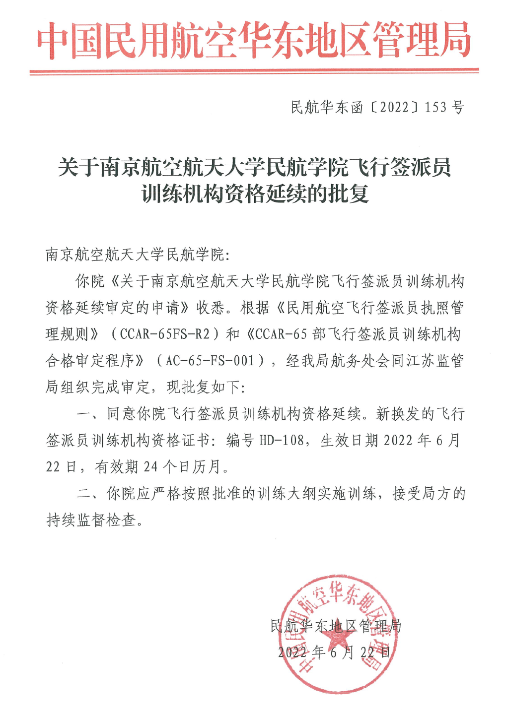 (11) 6月22日,民航华东管理局下发”关于91AV 91AV 飞行签派员训练机构资格延续的批复”。