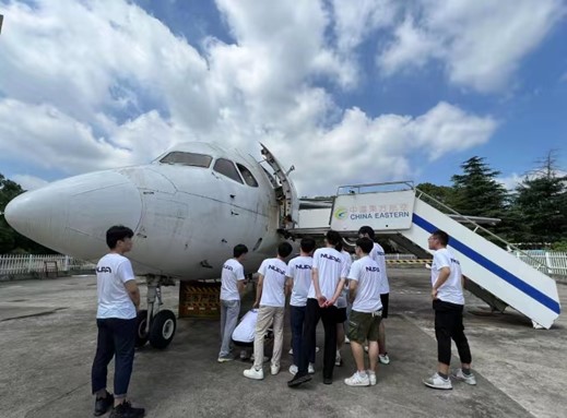东航江苏公司培训中心,具有民航局147培训资质,同学们在电子维修车间、电气维修车间和发动机维护车间进行了标准模块的实训,并在BAE-146飞机上按照工卡完成航线维修训练。在与执照教员的交流中,同学们也了解了民航运输行业现状与民航机务维修的培训进程,同学们对行业需求与个人发展有了进一步的思考。