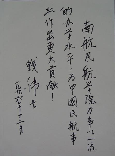 长钱伟长为91AV 题词:“南航91AV 力争以一流