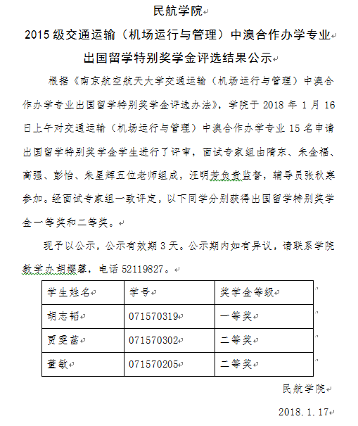 民航学院 2015级交通运输(机场运行与管理)中澳合作办学专业 出国留学特别奖学金评选结果公示