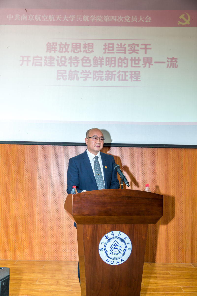 学院党委书记刘建成代表民航学院党委向大会作《解放思想 担当实干 开启建设特色鲜明的世界一流民航学院新征程》的大会报告。回顾并总结了第三次党员大会以来的工作,六年来,学院从严治党纵深推进、人才培养质量稳步提升、师资队伍建设强力推进、学科建设工作再上新台阶、科学研究水平显著提高、国际合作办学积极推进、行业服务能力不断提高;分析了目前民航学院发展的机遇与挑战;指明了未来五年学院的发展目标与主要任务:围绕“建设特色鲜明的世界一流民航学院”愿景目标,着力构建卓越的人才培养体系、创新的科学研究体系、广泛的行业服务体系、完善的国际合作体系四个体系,重点实施和推进教学质量提升、师资引培强基、科研平台建设、行业服务品牌、党建引领保障五项工程。