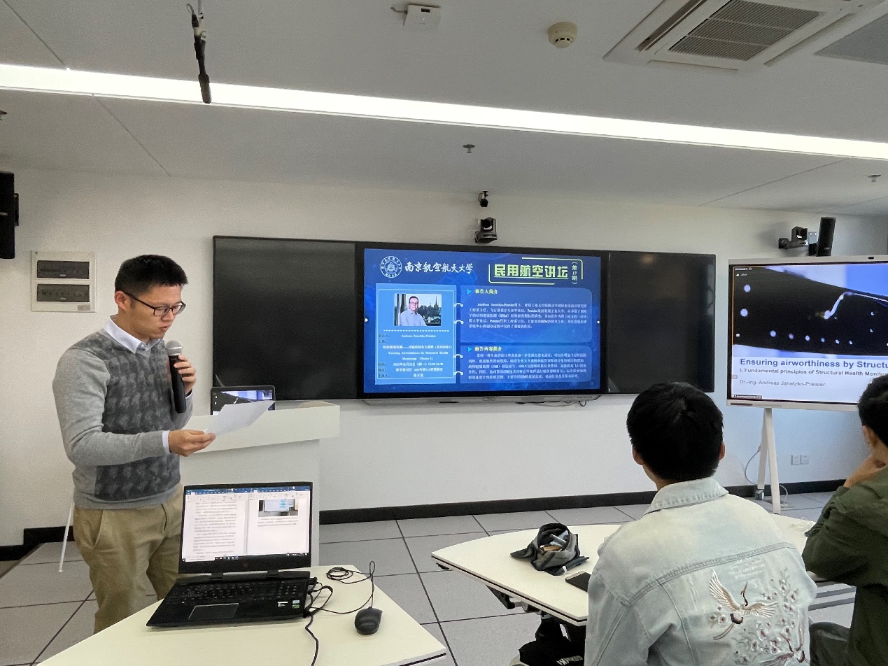 11月22日下午,“民用航空讲坛”第十七期讲座在将军路校区A08号楼312智慧教室成功举行。本次讲座由民航学院黄天翔老师主持。德国亚琛工业大学结构力学和轻量化设计研究所(SLA)工程系主任Andreas Janetzko-Preisler为师生带来了一场围绕结构健康监测展开的线上讲座。